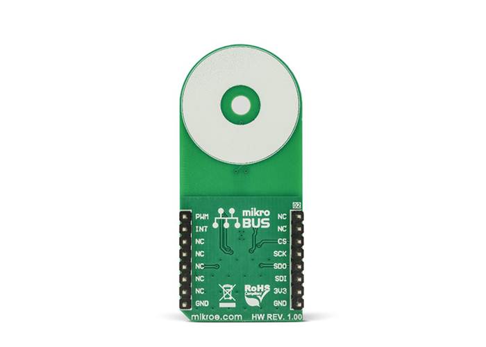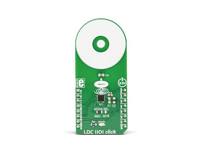 The main component of the Click is the LDC1101, an integrated high-resolution, high-speed inductance-to-digital converter, by Texas Instruments. This IC is a very versatile inductance converter, used for fast, short-range, contactless position, rotation, or motion of an object. Due to the used technology which allows very precise and reliable inductivity sensing even in harsh environments, the LDC1101 is well-suited to be used both in industrial and in automotive applications. The LDC1101 uses the standard SPI interface to be interfaced with the host MCU.