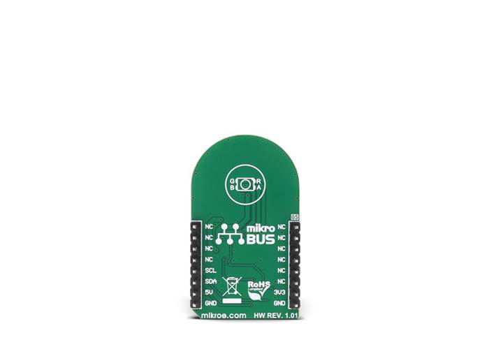 The Click board™ is also equipped with an RGB LED. This is a high brightness RGB LED with a wide viewing angle, that can get very hot and bright while operated with maximum current. For this reason, a care must be taken not to touch it or watch directly at the LED.