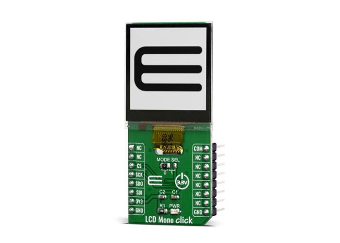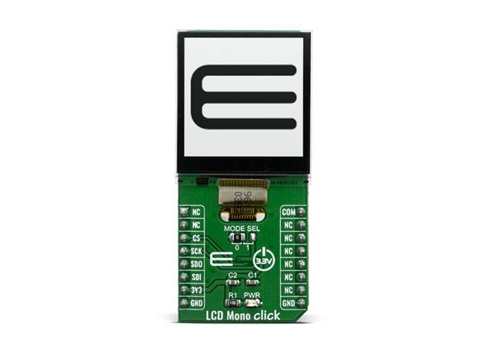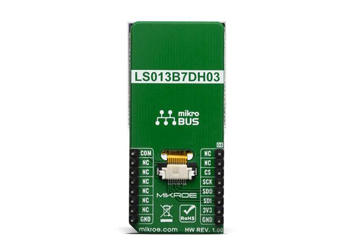 The display used for this Click, the LS013B7DH03 LCD, is a 1.28", 128x128 pixels monochrome display, with a 3-wire SPI interface. Apart from the SPI interface, the display requires a 3.3V power supply, and 3 extra pins named EXTMODE, EXTCOMIN and DISP. The SPI protocol consists of three modes. At the start of each SPI transfer, a mode command (1 byte) is sent first. The modes are: