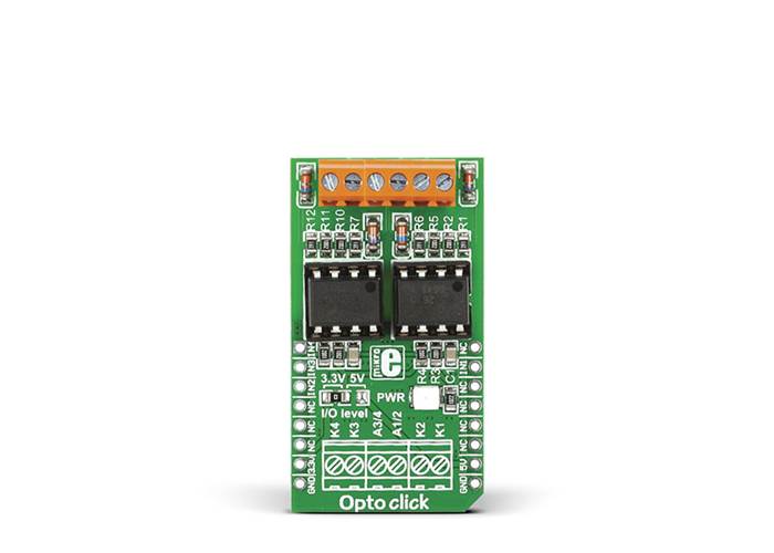 MIKROE OPTO Click is an accessory board in mikroBUS™ form factor. It features two VO2630 dual channel, high speed optocoupler modules. They enable high speed (10 MBit/s) data transfer between it’s input and output with galvanic isolation.