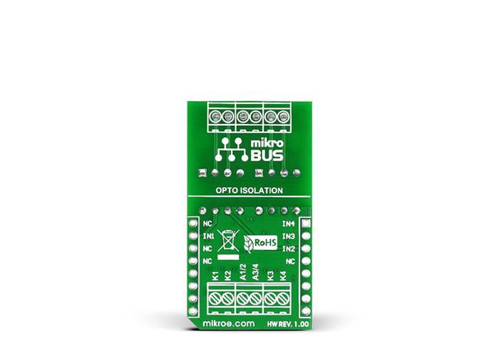MIKROE OPTO Click is an accessory board in mikroBUS™ form factor. It features two VO2630 dual channel, high speed optocoupler modules. They enable high speed (10 MBit/s) data transfer between it’s input and output with galvanic isolation. Optocouplers are connected to four lines (INT, CS, RST and AN) on mikroBUS™ socket. Board features six screw terminals for easier connections and a LED indicator of power supply. SMD jumper is available for selecting whether board will be operating on 3.3V or 5V power supply.