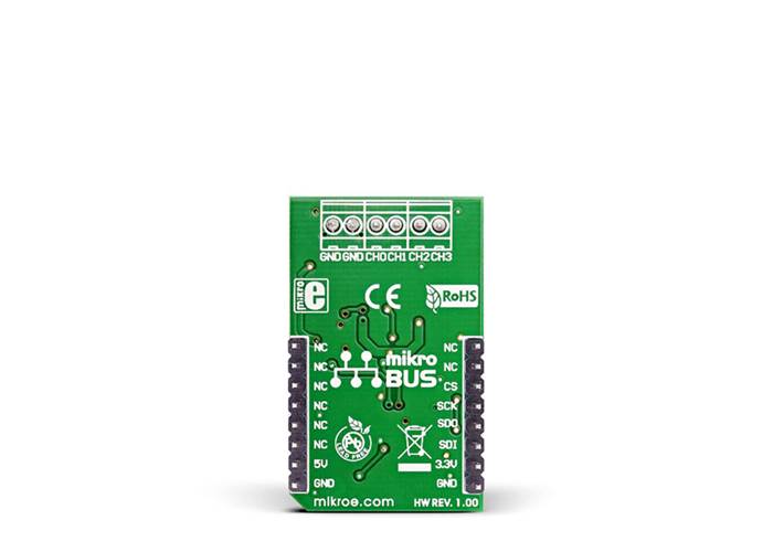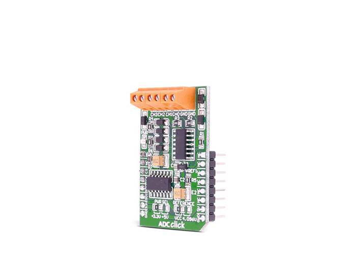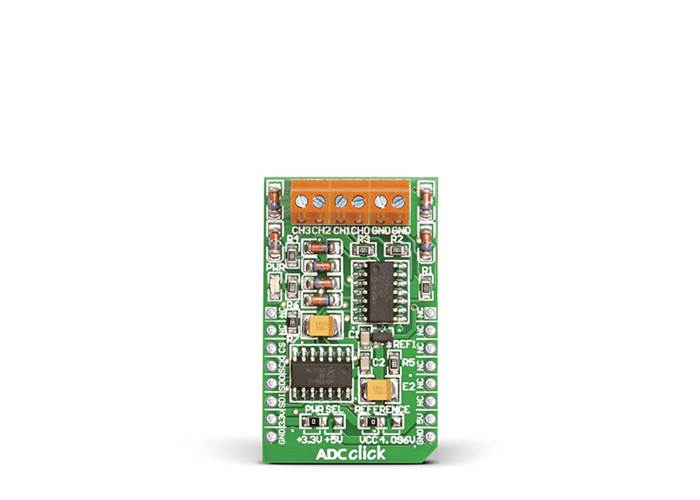MIKROE ADC Click carries the MCP3204 12-bit Analogue-to-Digital converter. The Click is designed to run on 3.3V by default. Place PWR SEL SMD jumper to 5V position if used with 5V systems. It communicates with the target microcontroller over SPI interface.