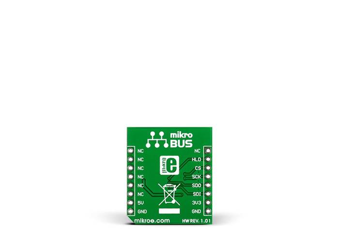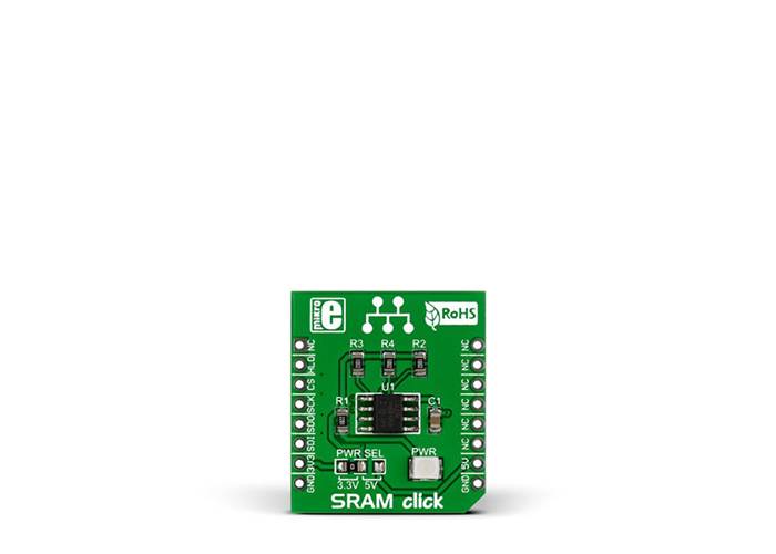 MIKROE SRAM Click lets you add 1 Mbit of additional SRAM memory to your devices, via the 23LC1024 chip. It organizes the memory in 8-bit instruction registers and 32-byte pages.