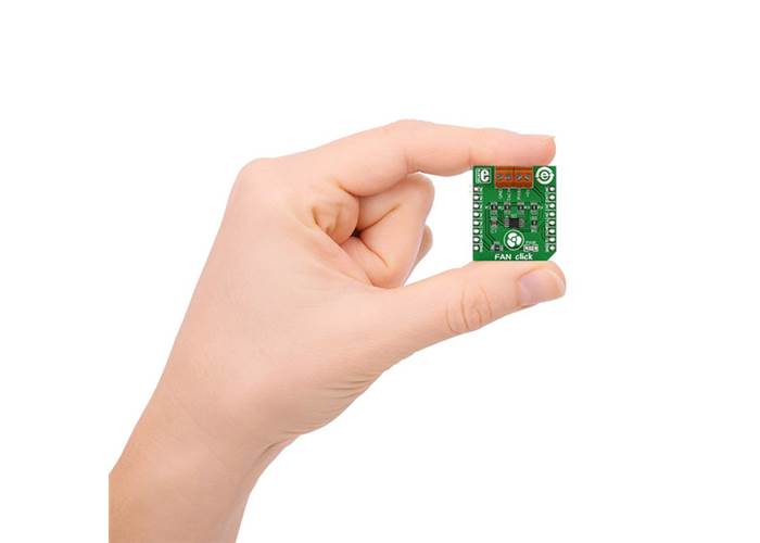 MIKROE Fan Click carries an EMC2301 controller for powering and regulating the operation of 5V four-wire fans, which are commonly utilised as coolers in computers and other electronics. The controller supports PWM speeds from 9.5Hz to 29 KHz, in four programmable frequency bands.