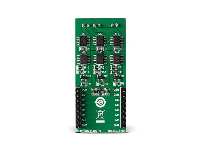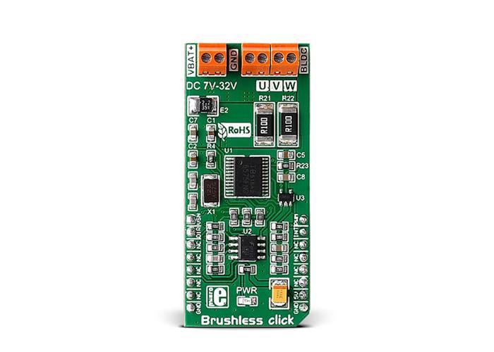 MIKROE Brushless Click carries Toshiba's TB6575FNG IC for driving 3-phase full-wave Brushless DC motors — which are ideal for powering flying drones. The click is able to safely drive external motors with up to 32V/2A.