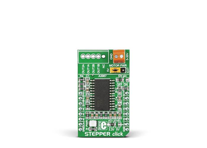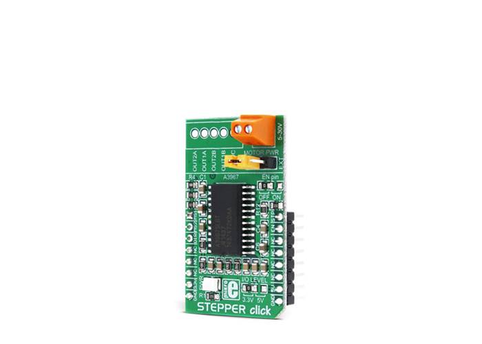 MIKROE Stepper Click is a complete solution for driving bipolar stepper motors with full/half and micro-steps. It features the A3967 IC from Allegro Microsystems with proprietary Satlington™ sink drivers on its outputs, which ensure high efficiency and reliable operation of the internal H-Bridges. This IC has the integrated translation section, used to simplify the control: using simple step control inputs from the host MCU, the stepper motor can be driven in both directions, with the predetermined step sizes. In addition, the output current is regulated allowing for noiseless operation of the stepper motor, with no resonance and ringing typically observed at unregulated stepper driver designs.