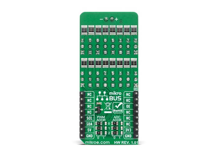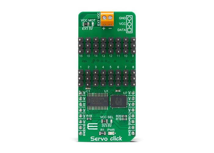 Servo Click is based on the PCA9685, an integrated 12-bit 16-channel PWM driver which can be configured to either sink 25mA per channel or drive each channel sourcing up to 10mA from NXP. Each channel has its duty cycle independently set from 0% to 100%. Offering 16 independent channels, each with its own PWM duty cycle and current sensing ability, this Click board™ represents a powerful servo controller, especially useful when a large number of servos needs to be controlled simply and easily. The frequency of the control PWM signal can be programmed in the range from 24 Hz to 1526 Hz.