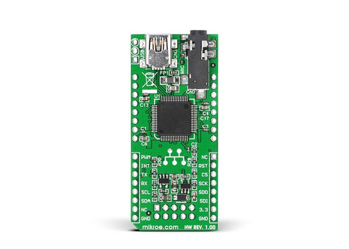 The MIKROE SpeakUp Click is a speech recognition Click board™. You can set it up to recognise over 200 different voice commands and have the on-board MCU carry them out instantly.Using a simple interface on your computer, you record a word or phrase (up to 2 seconds) and assign it an instruction. Repeat for as many commands as you need.When you put it to work, it listens to what you're saying, matches the sound to one of the pre-recorded commands, and triggers the specified action which the on-board MCU executes.