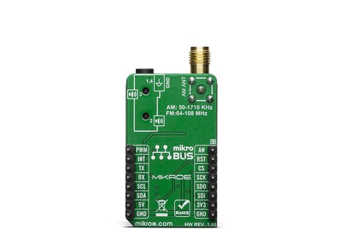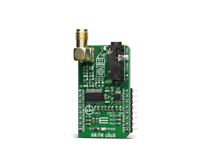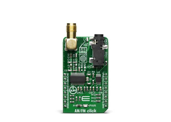 MIKROE AM/FM Click is a RADIO RECEIVER Click board™ that can be used to listen to music from the AM and FM radio bands.