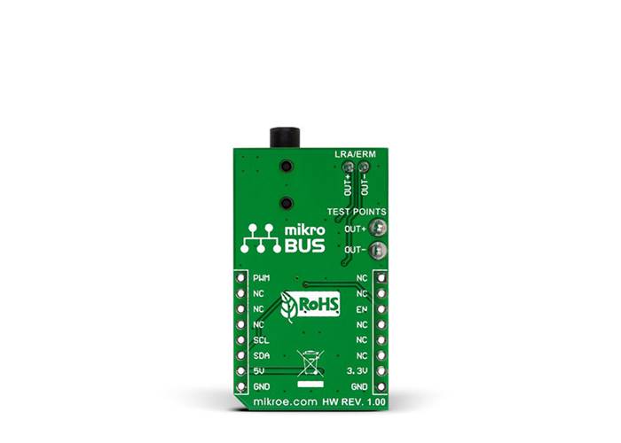 MIKROE Haptic Click carries DRV2605, a Haptic Driver for ERM and LRA vibration motors (acronyms stand for Eccentric Rotating Mass and Linear Resonant Actuator, respectively). The DRV2605 IC integrates an extensive library with over 100 haptic effects.