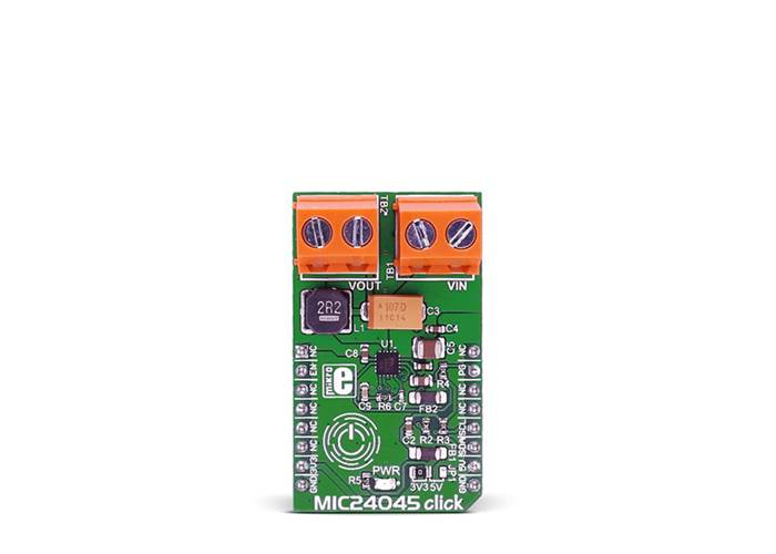 MIKROE MIC24045 Click carries MIC24045 I2C-programmable, high-efficiency, wide input range, 5A synchronous step-down regulator from Microchip. The Click is designed to run on either 3.3V or 5V power supply.