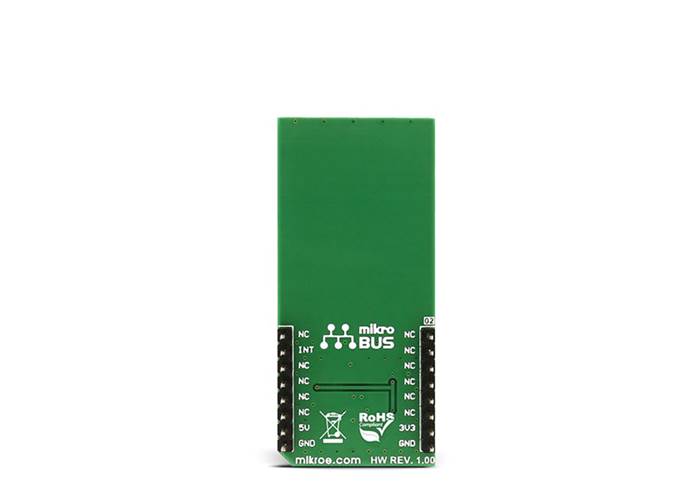 Since the voltage of the reference divider connected to the non-inverting input is VCC/2, the output of the comparator is at zero voltage. Once the liquid is present at the sensory area, it's resistance drops and pulls the voltage on the inverting input of the comparator towards zero volts. Once this voltage falls below VCC/2, the comparator output swings towards VCC signalling the presence of liquid. The comparator output is tied to the INT pin on the mikroBUS™ header.