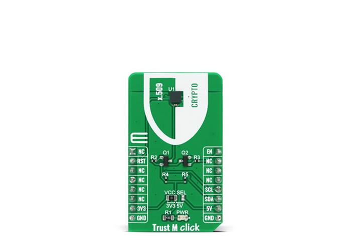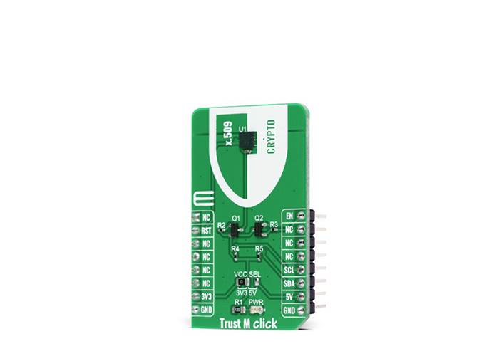 MIKROE Trust M Click is trust anchor add-on board for advanced security combined with high performance for connected devices that address individual needs in the field of embedded authentication, brand protection and further security applications.