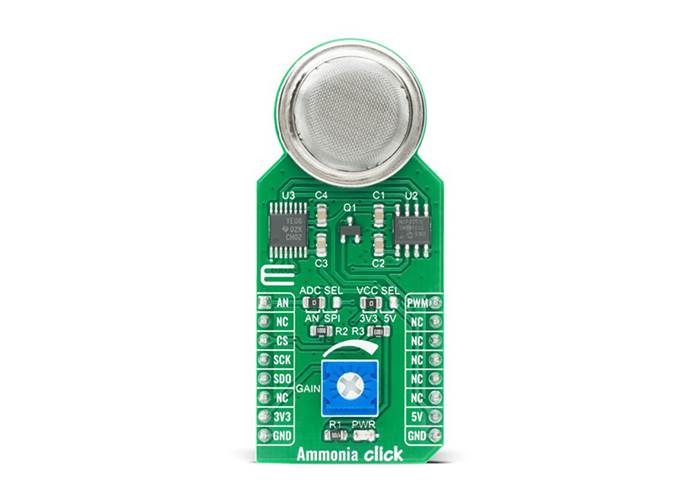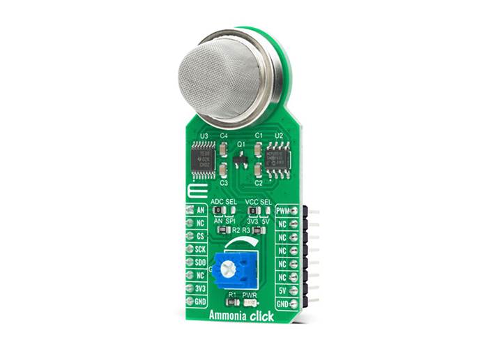 MIKROE Ammonia Click is an Ammonia detection (NH3) sensor, based on the MQ-137 petrol sensor. This petrol sensor has a sensitive layer made of SnO2, which changes its resistance when exposed to ammonia. The sensor is able to sense NH3 concentration in the range of 5 ppm to 200 ppm.