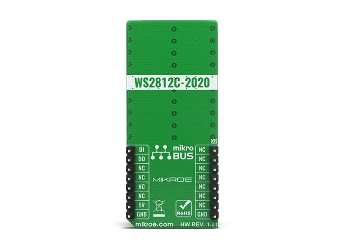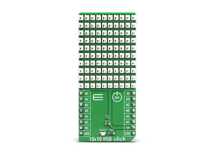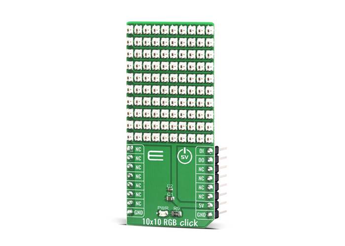 MIKROE 10x10 RGB Click is a matrix of 100 "intelligent" RGB elements, forming a 10x10 display screen. These LED elements feature internal logic, which allows them to communicate directly with the MCU.