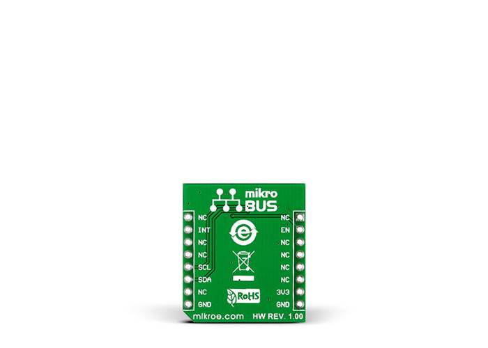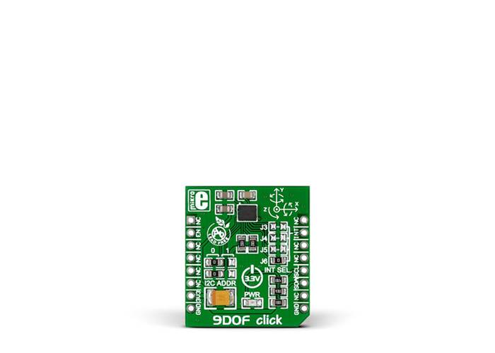 MIKROE 9DOF Click carries ST.’s LSM9DS1 inertial measurement module that combines a 3D accelerometer, a 3D gyroscope and a 3D magnetometer into a single device outputting so called nine degrees of freedom data (3-axis acceleration, angular velocity and heading), in 16-bit resolution. 9DOF click communicates with the target MCU through the mikroBUS I2C interface (SCL and SDA) with additional functionality provided by the programmable Interrupt (INT) pin, as well as the Enable (EN) pin. The IC has multiple interrupt lines which can be accessed through jumpers on the click board. I2C addresses are specified in the same manner. The board uses a 3.3 power supply only.