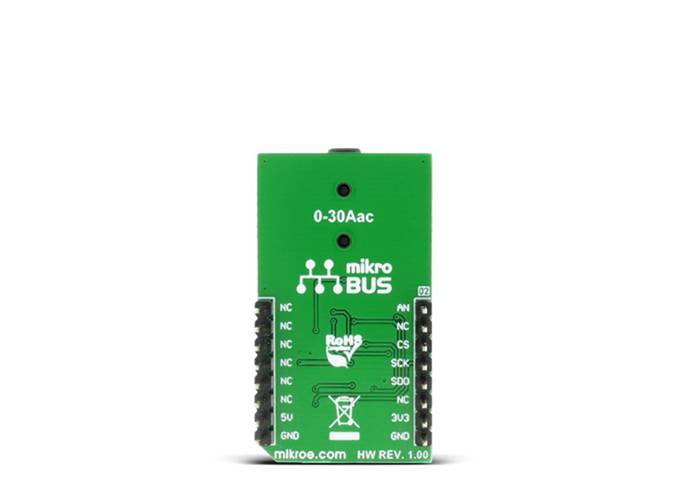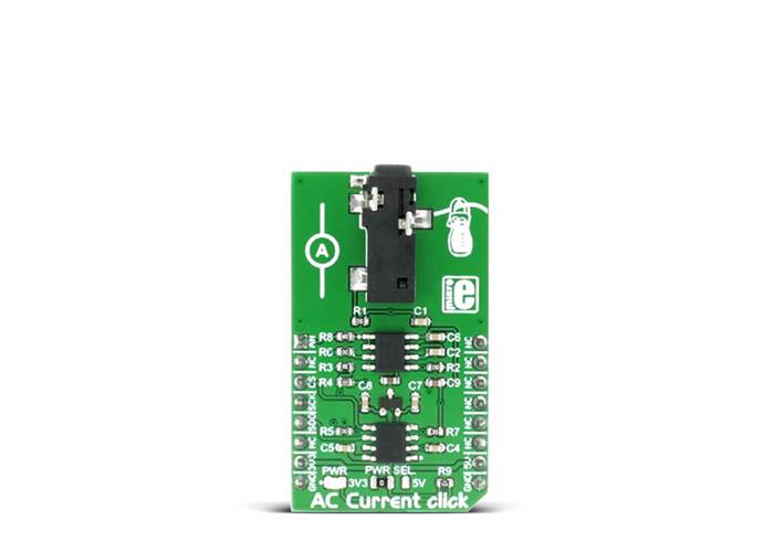 The Click board™ comes equipped with the 3.5mm jack connector which is used to attach the sensing probe. The sensor input is filtered and amplified so that the readings can stay reliable and protected against EMI and radio-interferences. The low-noise 12-bit SAR A/D converter (ADC) converts the sensor voltage, providing conversion data via the industry-standard SPI interface. Besides the onboard A/D converter, there is an analogue signal path available to the users, allowing the Click board™ to fit into various usage scenarios. Featuring a high precision ADC and a low noise, rail to rail dual operational amplifier, designed to work with the contactless non-invasive current sensor, AC Current click is an ideal solution for measuring AC Current through mains and other cables with otherwise dangerous voltages, current consumption monitoring, and similar applications.