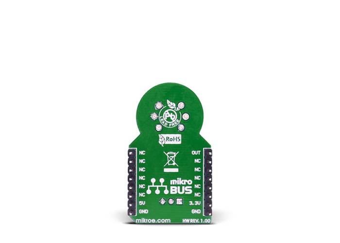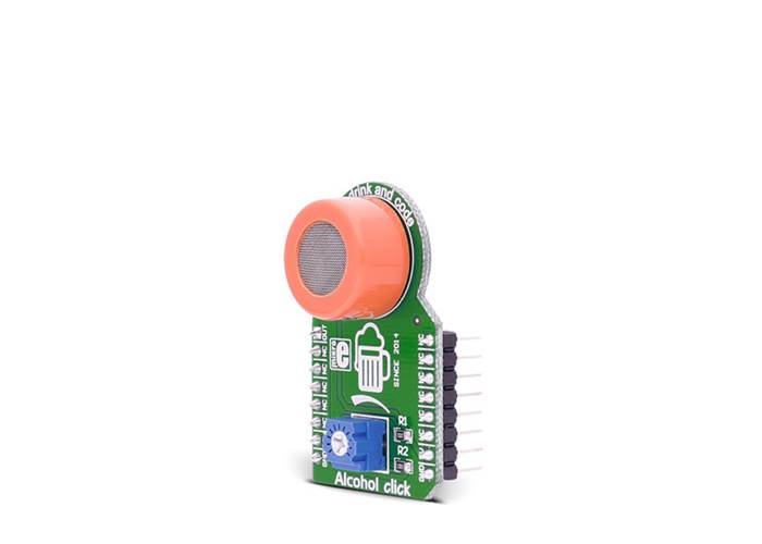 MIKROE Alcohol Click has a high sensitivity to alcohol and it can be used to detect alcohol in concentrations from 0.04 to 4mg/l. Alcohol Click carries an MQ-3 Semiconductor sensor for alcohol. The Click is designed to run on a 5V power supply only.