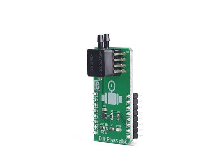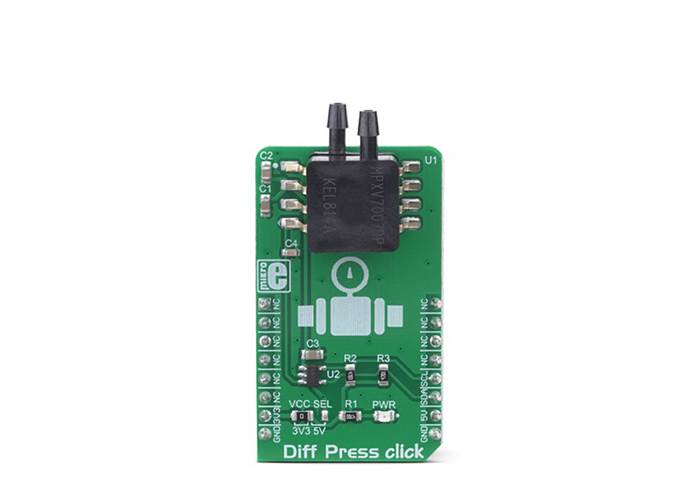 MIKROE Diff Press Click is an accurate pressure sensor Click board™ capable of measuring differential pressure. This Click board™ utilizes a very precise differential pressure sensor from NXP, labelled as MPXV7007DP.