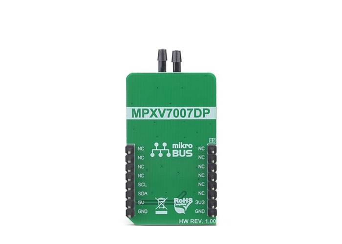 The MPXV7007DP sensor is shaped so two small tubes can be attached to it, simplifying its practical application. This makes this Click board™ an ideal solution for monitoring the pressure in different kinds of HVAC applications, hospital beds, respiratory systems, process control, and similar applications which rely on an accurate and reliable pressure monitoring.