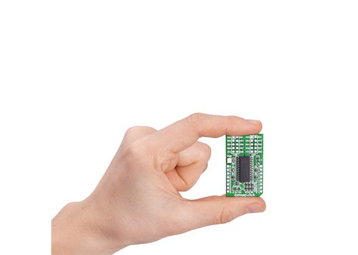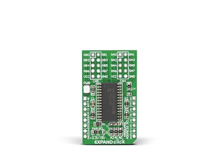 MIKROE Expand Click is an accessory board in mikroBUS™ form factor. It includes a 16-bit I/O expander MCP23S17 with SPI clock speeds up to 10 MHz for higher throughput applications. Three HARDWARE ADDRESS SEL jumpers allow you to configure board address and connect up to eight devices on the bus. Controller also supports interrupt-on-change feature. Board is set to use 3.3V power supply by default. Solder PWR SEL SMD jumper to 5V position if used with 5V systems.
