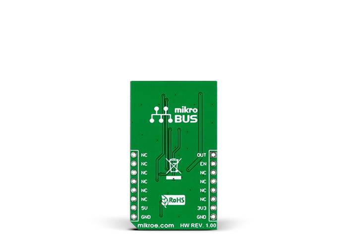 The Click board™ outputs an analogue voltage corresponding to the distance of the object (through the mikroBUS™ AN pin). An Enable (EN) pin is also utilised.