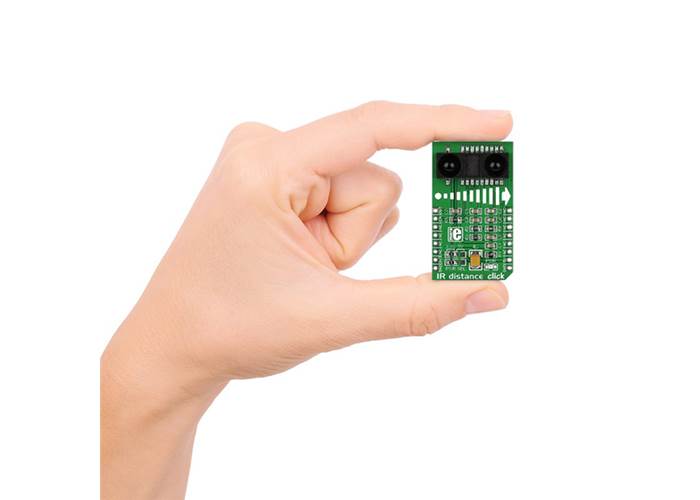 IR distance Click carries Sharp’s GP2Y0A60SZ0F distance measuring sensor, which comprises of an integrated PSD (position sensitive detector), an infrared LED and a signal processing circuit. The measuring range is between 10 and 150 cm.