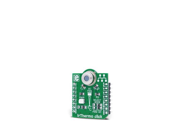 IrThermo Click 5V is a contactless temperature measurement device that relies on the accurate thermopile sensor chip, which encompasses both the thermopile sensor element and the ASSP. The ASSP - signal conditioning circuitry features 17bit ADC and powerful DSP which allow high degree of accuracy and wide temperature measurement range. The IrThermo Click is equipped with both the 10bit PWM interface and the SMBus/I2C interface.
