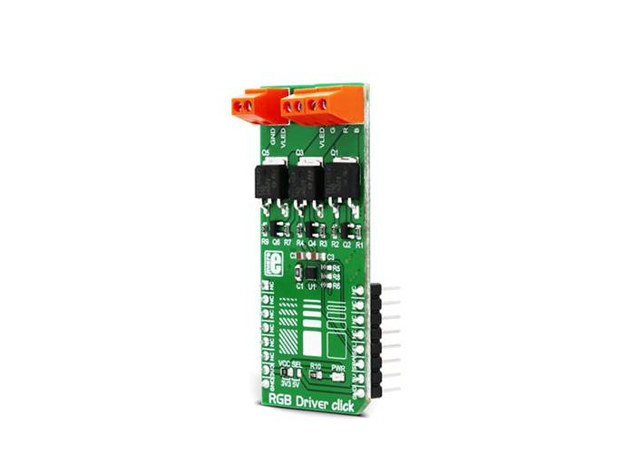 MIKROE RGB Driver Click is an RGB LED driver, capable of driving RGB LED stripes, LED fixtures and other RGB LED applications that demand an increased amount of current and voltage.