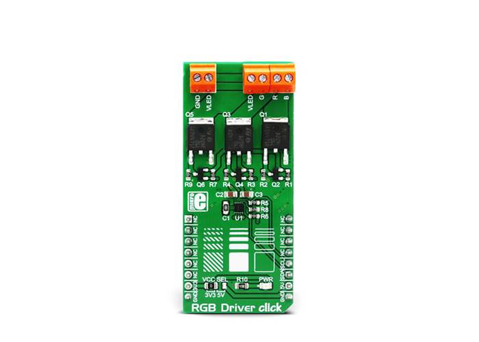 SCL and SDA lines of the IC are routed to the mikroBUS™ and allow secure and simple connection with the host MCU. The Click board™ is capable of interfacing to both 3.3V and 5V MCUs. This can be done by switching the small SMD jumper labelled as VCC SEL to the required position, selecting the appropriate logic voltage level. Output screw terminals are used to securely connect the LED power supply, as well as the R, G, and B LED channels.