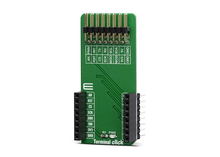 MIKROE Terminal Click is a mikroBUS™ socket expansion board, which provides an easy and elegant solution for adding the external connection capability to the Click board™, plugged on a mikroBUS™. Featuring stacking headers makes it easy way for expanding the connectivity of the development system with the mikroBUS™, while keeping the bus free to use with any Click board™.