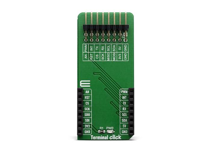 Terminal Click consists of a high-quality PCB that can be connected to the mikroBUS™ as any other Click board. On the top of the Terminal Click, a 2x8 pin header is placed. Each of the header pins is corresponding to a pin on the mikroBUS™ being used. These are simply wired in parallel. Thanks to the stacking headers, the connection with the Click board™ remains firm and stable. Besides . Having this kind of stacking topology, allows for easy pin access and manipulation of the stacked Click boards™, retaining a perfect connection quality at all times.