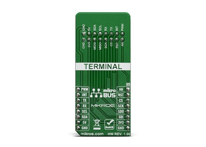 MIKROE Terminal Click is a mikroBUS™ socket expansion board, which provides an easy and elegant solution for adding the external connection capability to the Click board™, plugged on a mikroBUS™.