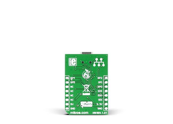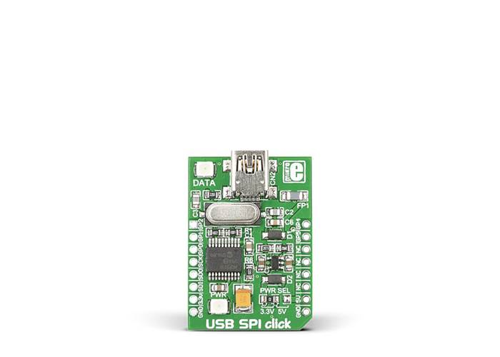 MIKROE USB SPI Click is an accessory board in mikroBUS form factor. It’s a compact and easy solution for adding SPI serial communication via USB cable. It features MCP2210 USB-to-SPI protocol converter with GPIO as well as USB MINI B connector. USB SPI Click communicates with target board via SPI interface as a controller device. SMD jumper is available for selecting whether board will be operating on 3.3V or 5V power supply. It has a LED diode (GREEN) that indicates the presence of power supply.