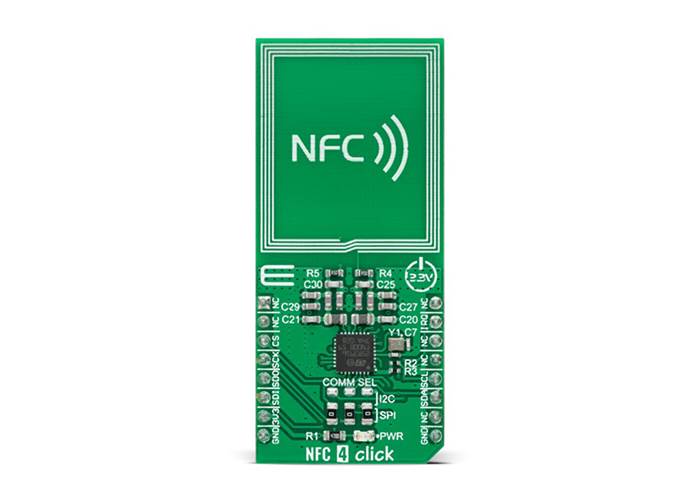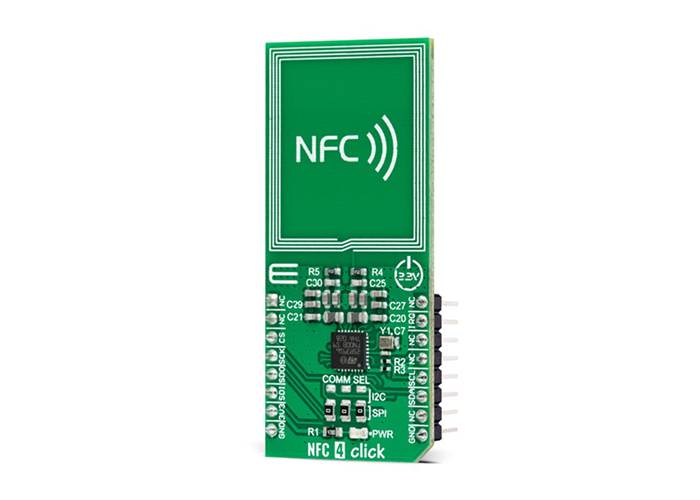 MIKROE NFC 4 Click is a compact add-on board that contains an NFC transceiver for contactless communication.