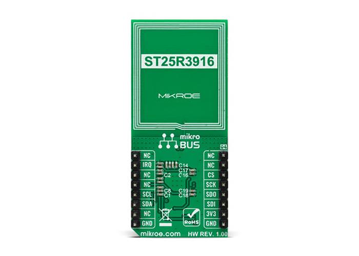MIKROE NFC 4 Click is a compact add-on board that contains an NFC transceiver for contactless communication. This board features the ST25R3916, a multi-purpose NFC transceiver supporting passive peer-to-peer functionality and NFC card-emulation mode, as well as NFC reader operation from STMicroelectronics. It features high RF output power to directly drive an antenna etched on the PCB, alongside its tuning circuit, at high efficiency. The ST25R3916 also represents an EMVCo reader fully compliant with ISO 14443A/B, ISO 15693, ISO 18092, Felica, and NFC Forum standards. Thanks to the ST25R3916, this Click board™ provides all the features designers need to quickly market and comply with relevant NFC specifications. This Click board™ represents an ideal solution for rapidly integrating NFC technology in any custom application.