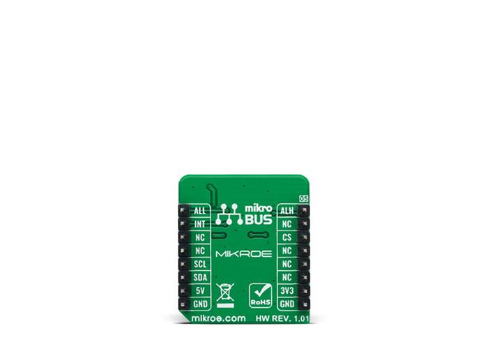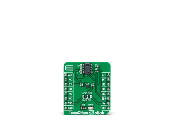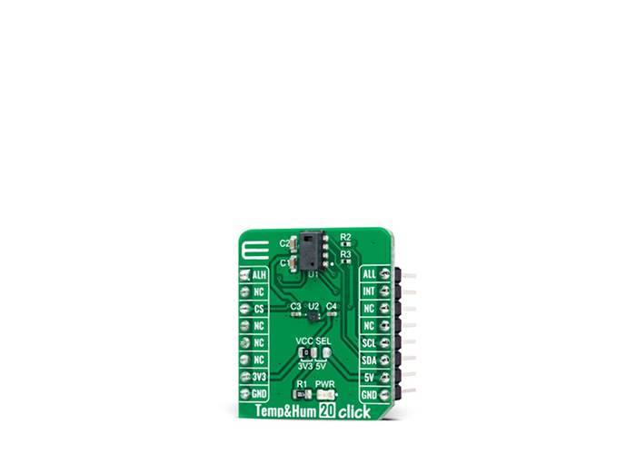 It also comes with alarm features, labelled as ALH and ALL and routed to the AN and PWM pins of the mikroBUS™ socket, for preset control at a minimum and maximum humidity, and additional data-ready signal routed on the INT pin of the mikroBUS™ socket indicating that new data is ready for the host.