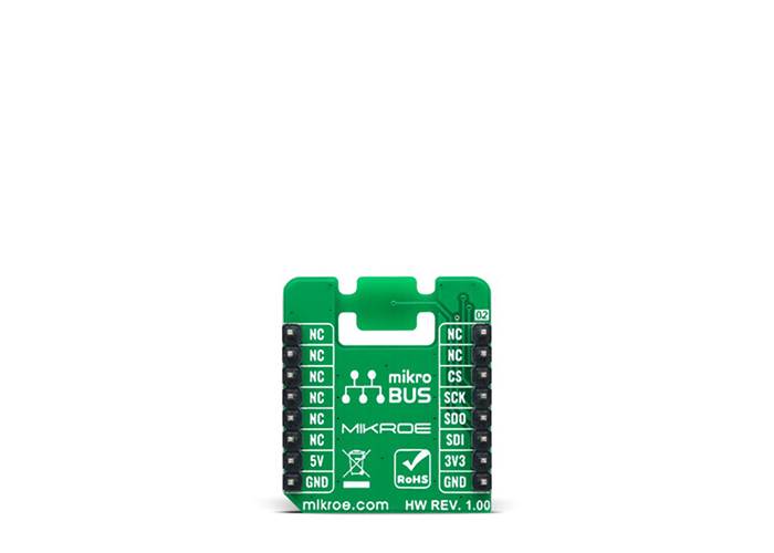 This Click board™ can operate with both 3.3V and 5V logic voltage levels selected via the VCC SEL jumper. This way, it is allowed for both 3.3V and 5V capable MCUs to use the SPI communication lines properly. However, the Click board™ comes equipped with a library that contains easy-to-use functions and an example code that can be used, as a reference, for further development.