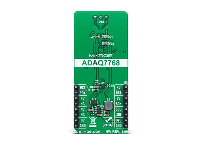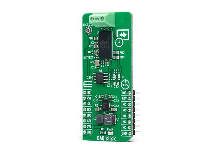MIKROE DAQ Click is a compact add-on board representing a data acquisition solution. This board features the ADAQ7768-1, a 24-bit precision data acquisition (DAQ) μModule system that encapsulates signal conditioning, conversion, and processing blocks into one SiP from Analogue Devices. It supports a fully differential input signal with a maximum voltage range of ±12V with an excellent common-mode rejection ratio (CMRR). The input signal is fully buffered with a low input bias current, enabling the ADAQ7768-1 to interface to sensors with high output impedance directly. Also, it comes with a selectable clock source and programmable gain options, output data rate, filter type, and latency configurable through an SPI serial interface. This Click board™ is suitable as a universal input measurement platform for electrical tests and measurements, condition monitoring for predictive maintenance, and many other applications.