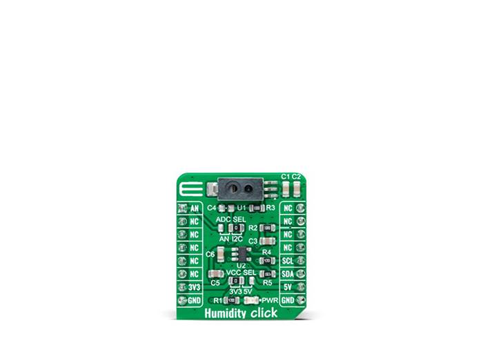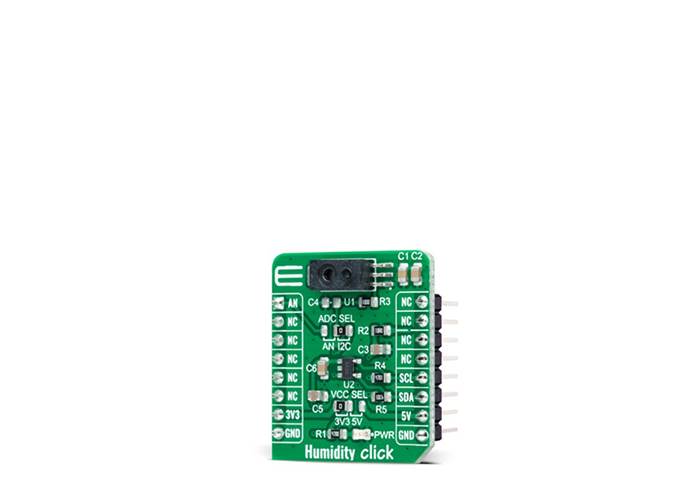 Humidity Click as its foundation uses the HIH-5030, a high-performance analogue-output relative humidity sensor from Honeywell Sensing and Productivity Solutions. The HIH-5030 surface-mounted, covered, condensation-resistant, integrated circuit humidity sensor factory-fitted with a hydrophobic filter allows usage in many condensing environments. It provides enhanced stability, accuracy, and response time over the entire humidity range of 0%RH to 100%RH with an accuracy of ±3%RH over a wide operating temperature range at the industry’s lowest power. This Click board™ is primarily developed for measuring the amount of water vapour in the air in industrial, medical, and commercial applications but can also be used in other application fields.