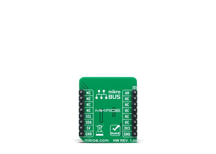 The output voltage of the HIH-5030 can be converted to a digital value using MCP3221, a successive approximation A/D converter with a 12-bit resolution from Microchip, using a 2-wire I2C compatible interface, or can be sent directly to an analogue pin of the mikroBUS™ socket labelled as AN. Selection can be performed by onboard SMD jumper labelled as ADC SEL to an appropriate position marked as AN and I2C.