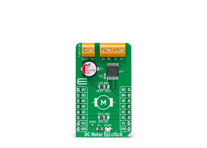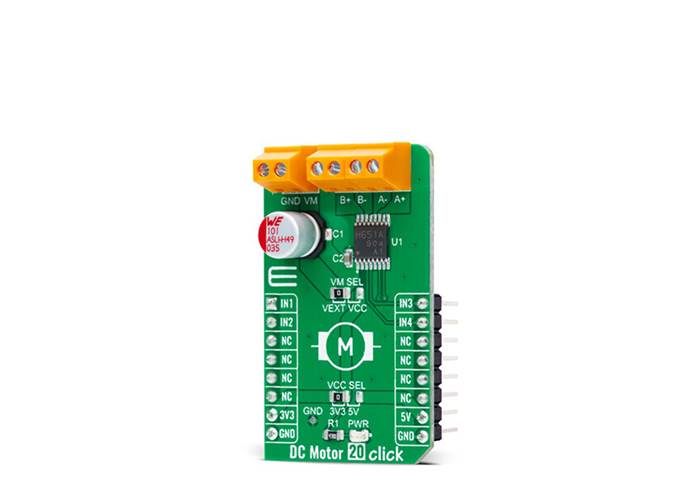 MIKROE DC Motor 20 Click is a compact add-on board that contains a brushed DC motor driver. This board features the TC78H651AFNG, a dual H-bridge driver for one or two DC brushed motors, which incorporates DMOS with low ON resistance in output transistors from Toshiba Semiconductor.