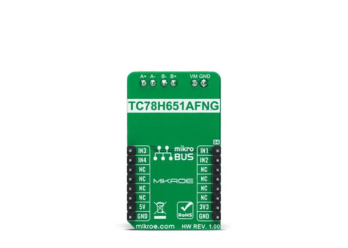 To turn ON the internal MOSFETs of the TC78H651AFNG, they need to be switched by the logic level, which is input to the control input pins: IN1, IN2, IN3, and IN4 pins routed to the RST, AN, PWM, and INT pins of the mikroBUS™ socket. Thereby, the Forward/Reverse/Stop rotation direction mode can be selected according to the state of its input control signals. More information on the Motor Rotation Mode Selection can be found in the attached datasheet.