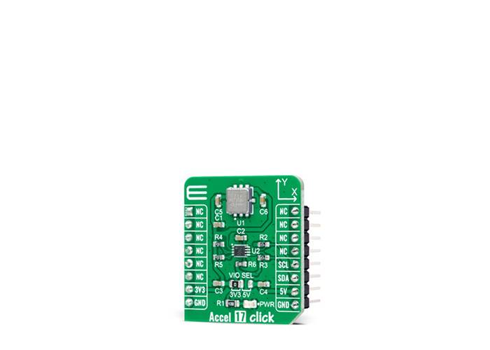 Accel 17 Click communicates with MCU using a standard I2C 2-Wire interface that supports 400kHz Fast Mode operation. Since the sensor for operation requires a 3.3V logic voltage level only, this Click board™ also features the PCA9306 voltage-level translator from Texas Instruments. The I2C interface bus lines are routed to the dual bidirectional voltage-level translator, allowing this Click board™ to work with both 3.3V and 5V MCUs properly.
