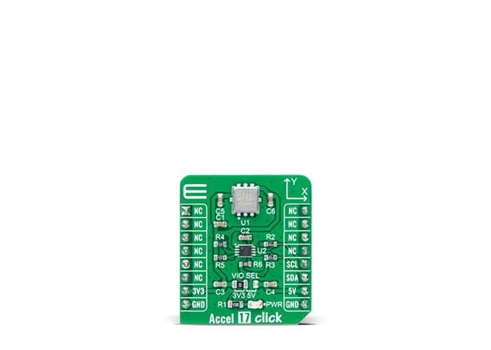 MIKROE Accel 17 Click is a compact add-on board that contains an acceleration sensor. This board features the MXC62320MP, a low-power digital output dual-axis accelerometer fabricated on a standard, submicron CMOS process from MEMSIC. The MXC62320MP can measure both dynamic acceleration (e.g., vibration) and static acceleration (e.g., gravity), with full-scale acceleration measurements, a range of ±2g, and a configurable host interface that supports I2C serial communication with 400kHz Fast Mode operation. This Click board™ is suitable for various applications such as vibration and condition monitoring, test and measurements, predictive maintenance, and more.