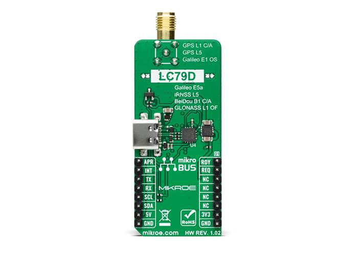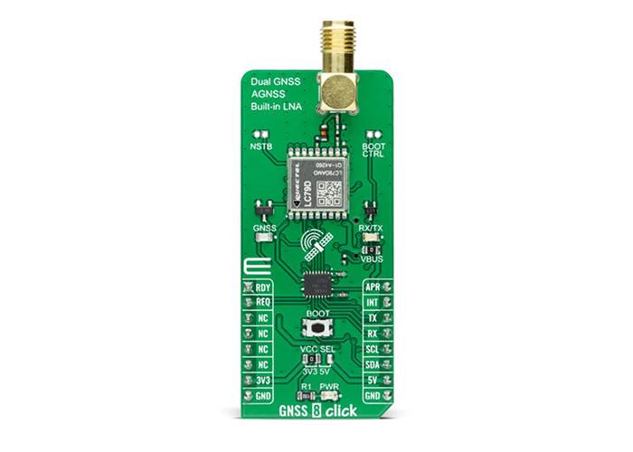 GNSS 8 Click as its foundation uses the LC79DA, a high-performance dual-band and multi-constellation GNSS module from Quectel Wireless Solutions. It supports L1 and L5 bands for GPS, Galileo, and QZSS, L1 band for GLONASS and BeiDou, as well as L5 band for IRNSS. Compared with the GNSS modules working on the L1 band only, LC79DA dramatically increases the number of satellites involved in tracking and positioning, reducing signal acquisition time and improving positioning accuracy even when the GNSS signal is absent or compromised. The LC79DA is AIS-140 compliant, and its on-board LNAs and SAW filters serve to ensure better positioning under weak signal conditions and other harsh environments, providing it with better performance in anti-jamming.