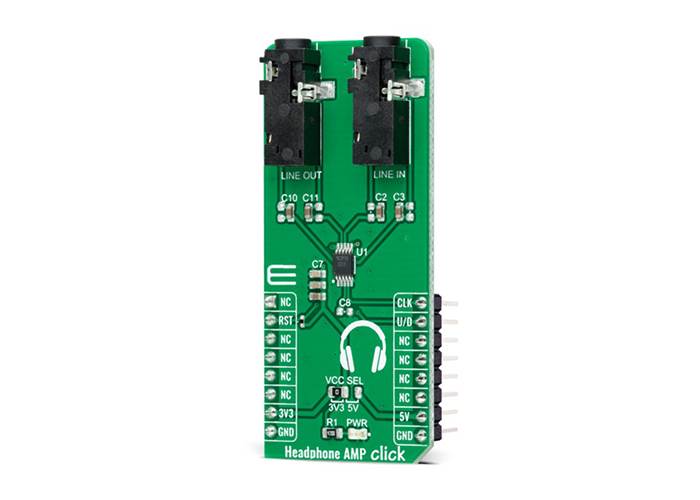 MIKROE Headphone AMP Click is a compact add-on board that contains a stereo headphone amplifier. This board features the LM4811, Boomer® audio power amplifier capable of delivering 105mW per channel with digital volume control from Texas Instruments.