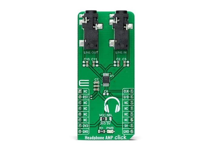 Headphone AMP Click as its foundation uses the LM4811, a stereo, analogue input headphone amplifier with digital volume control from Texas Instruments. This headphone amplifier is designed to provide a high-quality output power using few external components and does not require bootstrap capacitors or snubber networks for stability improvement. The maximum power delivered by the LM4811 headphone amplifier is 105mW per one channel into 16Ω and 70mW with 16Ω load impedance. Other prominent features of the ML4811 also include digital volume control, "Click and Pop" suppression circuitry, and a low shutdown current of 0.3μA typical.