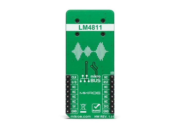 This Click board™ communicates with MCU using several GPIO pins. The signals from the CLK and U/D pins, routed to the PWM and INT pins of the mikroBUS™ socket, controls the LM4811's gain. At each rising edge of the CLK signal, the gain will increase or decrease by a 3dB step depending on the logic voltage level applied to the U/D pin. A logic high voltage level applied to the U/D pin causes the gain to increase by 3dB at each rising edge of the CLK signal and vice versa. Upon devices' Power-On features, the amplifier's gain is set to a default value of 0dB. Sixteen discrete gain settings are available, ranging from +12dB maximum to −33dB minimum.