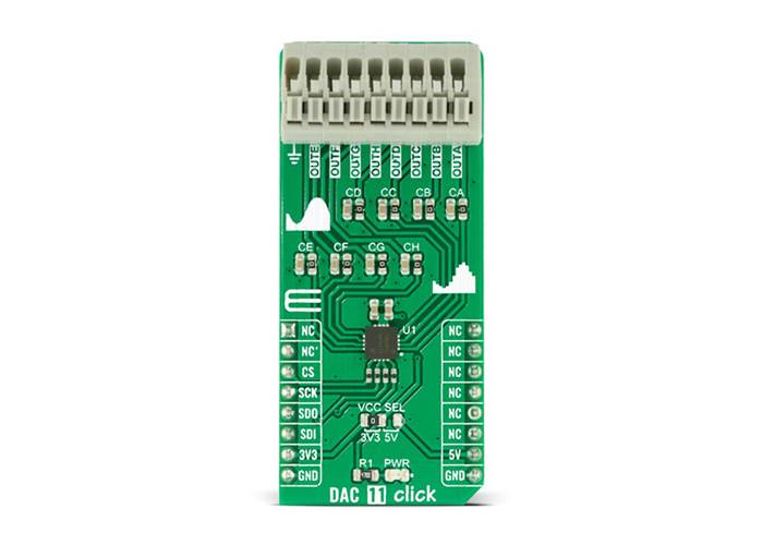 MIKROE DAC 11 Click is a compact add-on board that contains a highly accurate digital-to-analogue converter. This board features the DAC128S085, a general-purpose OCTAL 12-bit analogue voltage-output DAC from Texas Instruments.